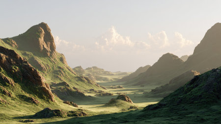 A tranquil scene unfolds with smooth hills bathed in soft light. The atmosphere feels otherworldly, evoking a sense of wonder and calm in this unique setting.