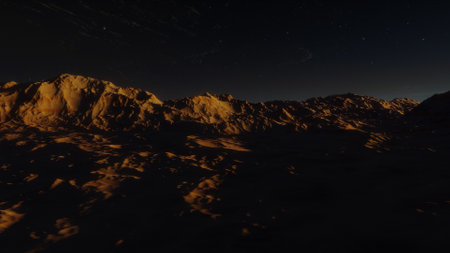 Cinematic view of rocky desert landscape illuminated by sunset colors