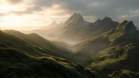 Experience a breathtaking view of a serene landscape featuring majestic mountains and lush green valleys under a clear sky at dawn, perfect for inspiration.