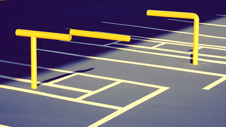 Yellow hurdles on a marked sports surface, illuminated by sunlight, creating strong shadows. Ideal for sports, fitness, and training themes.