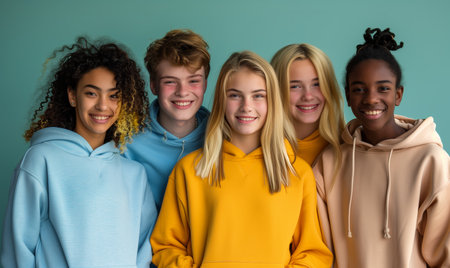 A diverse group of teenagers standing against a vibrant, multicolored background, expressing unity and youth. Perfect for concepts related to friendship, diversity, and modern fashion.
