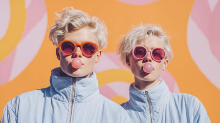 Two fashion twins stand close together wearing pastel blue jackets. They blow bubblegum while posing against a colorful candycore background. The scene feels playful and lively.