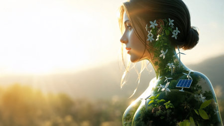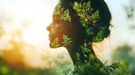 The image features a woman's profile, seamlessly blending with vibrant green foliage. The sunlight casts a warm glow, creating an ethereal quality. The background appears partially transparent, emphasizing the connection between humanity and nature. This poignant representation showcases the beauty of environmental sustainability and harmony.