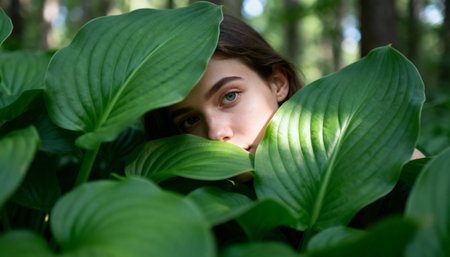 Close-up of a woman partially hidden behind large green leaves in a forest. Natural sunlight filters through the foliage, creating a serene and mysterious atmosphere.