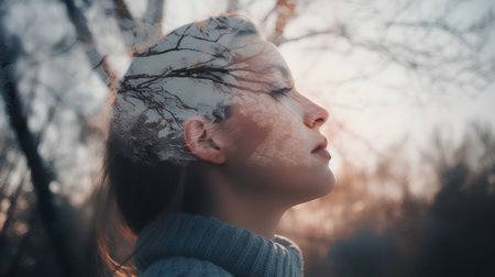 Double exposure of a young woman and nature background, symbolizing harmony and connection with the natural world in a modern context
