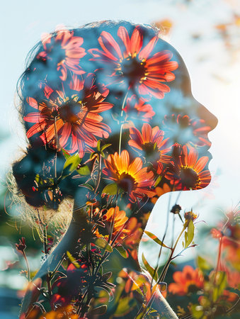 Double exposure of a woman with flowers and greenery. Nature and self-reflection concept
