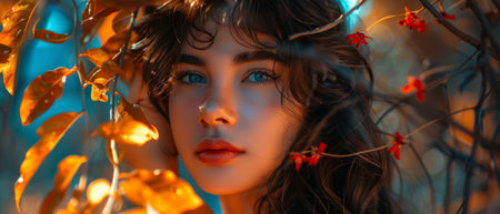 Portrait of a beautiful young woman with dark hair in a frame of branches and green leaves, summer and spring sensual portrait, natural beauty