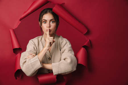 Caucasian young brunette happy woman gesturing silent sign with finger isolated through red background
