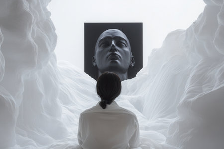 A solitary figure stands before a large screen displaying swirling, abstract imagery, creating a sense of wonder and contemplation.