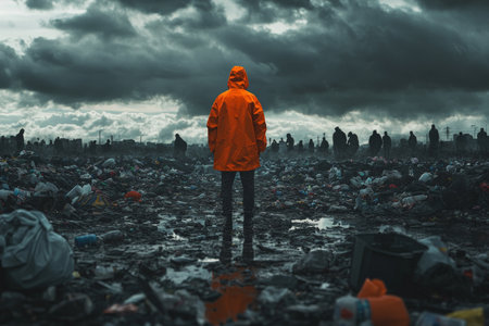 A solitary figure in an orange raincoat amidst a crowded, gloomy scene with litter and dark skies