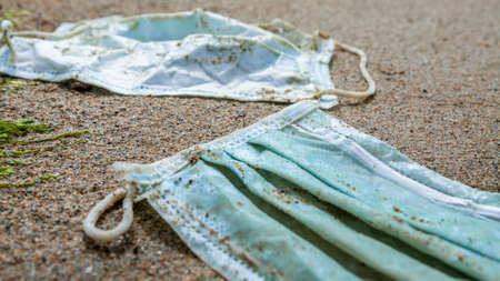 Green medical mask waste during COVID19. Discarded to ocean coronavirus single-use face masks. Environmental and coast plastic pollution. Trash in beach threatening the health of oceans