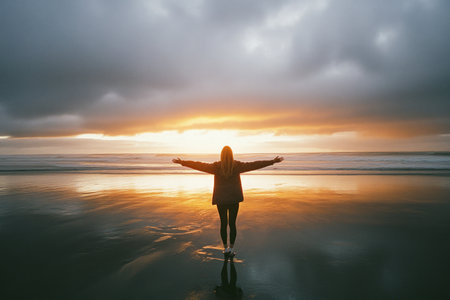 A woman stands with arms wide open, smiling towards the sun. The photo presents a medium shot of her against the ocean. Warm sunlight bathes the scene. Soft colors and a shallow depth of field create a peaceful atmosphere. Ideal for conveying joy and serenity in various visual projects.