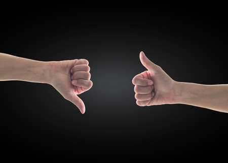 Like - unlike hand with thumb up - down symbolic people gesture isolated on black background with clipping path