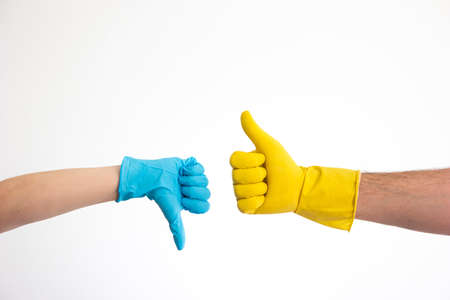 Caucasian woman and man hand in blue and yellow latex gloves doing the thumb up and down signs isolate on white 2020