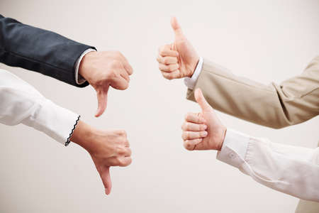 Close-up Of Two Businessman's Hands Showing Thumbs Up And Down Sign Against Gray Background