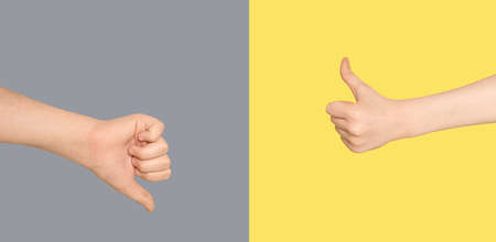 Human hands with thumb up and thumb down on a colored background. Elections, voting, conflict concept.