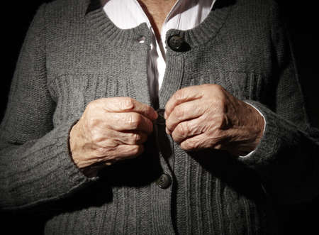 Old hands of an unrecognizable senior woman buttoning her self.