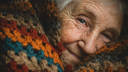 This intimate close-up portrait features an elderly woman warmly wrapped in a colorful blanket, radiating comfort and happiness. Her gentle smile and expressive eyes convey a profound sense of peace and tranquility, reflecting the beauty of aging and the warmth of home.