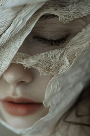A woman's face is covered in paper, giving the impression of a mask. The image has a surreal and dreamlike quality, with the woman's features obscured by the paper. Scene is mysterious and intriguing