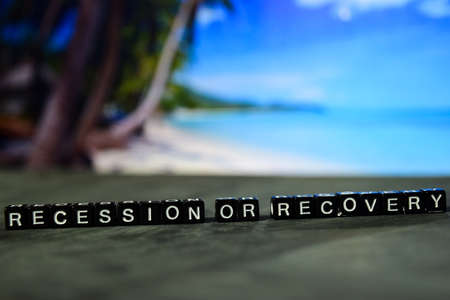 Recession or recovery on wooden blocks. Business and finance concept. Cross processed image with bokeh background