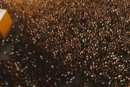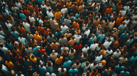 People walking at city street, aerial view. Protesting crowd. Generative AI