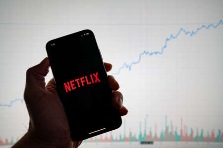 Netflix app on phone with white financial stock chart with price rising upward positive in background