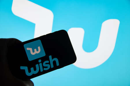 Rheinbach, Germany 25 March 2022, The brand logo of the e-commerce platform Wish on the display of a smartphone (focus on the brand logo)