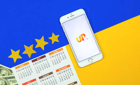 Kharkov, Ukraine - February 5, 2021: Skyup application on Apple smrtaphone, aircraft company service for air transportation, creative flat lay background and mockup