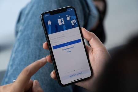 CHIANG MAI, THAILAND, FEB 14, 2022 : Facebook social media app logo on log-in, sign-up registration page on mobile app screen on iPhone smart devices in business persons hand at work.