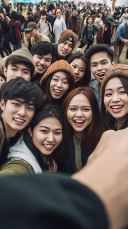 Just for fun Group of cheerful young people bonding to each other and making selfieon camera while having fun on the roof : Generative AI
