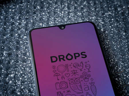 Lod, Israel - July 8, 2020: Drops - Language learning app launch screen with logo on the display of a black mobile smartphone on a metallic background. Close up top view flat lay.