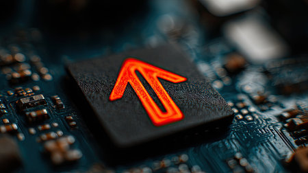 This image features a sleek arrow symbolizing financial success, set against a detailed circuit board background. Ideal for financial themes, technology, and innovation concepts.