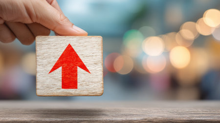 Hand holding red arrow icon on wooden cube over blur bokeh light background, Business growth concept