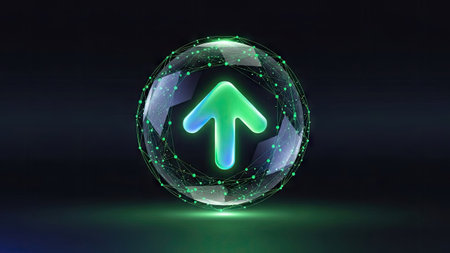 A digitally rendered image features a luminous green arrow encased in a transparent sphere. The sphere is detailed with interconnected points, suggesting a network. The composition is set against a dark backdrop, creating a contrast that highlights the central subject. This graphic could be utilized for various commercial and editorial applications.
