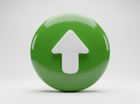 This image features a glossy green sphere with a prominent white up arrow in the center. The sphere is isolated against a white background, creating a clean and minimalistic appearance. The up arrow symbolizes advancement or progress.