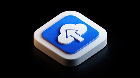 A three-dimensional render depicts a cloud symbol with an upward arrow. The design features a square shape, a vibrant blue color, and white elements. The illustration has a modern style against a dark background, suggesting digital environments and data transfer. Suitable for various commercial and editorial applications.