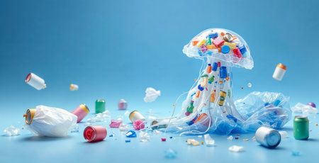 Plastic waste forming jellyfish polluting ocean: environmental issue concept. Plastic garbage forming jellyfish polluting ocean, highlighting environmental plastic pollution issue
