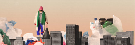 Man carries a bunch of plastic garbage, trash. Environmental pollution. Modern design. Contemporary conceptual art collage.