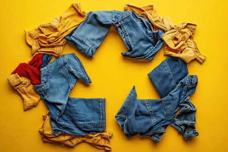 Visually stunning, this image portrays a Recycle symbol crafted from old clothes against a yellow backdrop, embodying sustainable fashion It encourages mindful consumption and textile waste reduction via upcycling Inspiring innovative designs from discarded garments, it advocates for ethical fashion practices and circular economy principles, urging viewers towards eco-conscious choices AI Generative