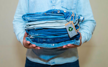 Promoting eco conscious clothing choices, a man wears a recycled denim jacket featuring a recycling symbol, advocating for sustainable fashion practices