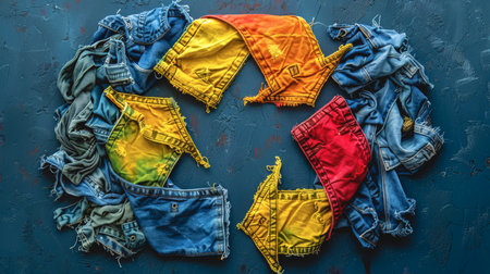 Creative sustainable fashion photo with denim arrows and fabric pile visualizes eco-conscious recycling, textile reuse, and circular clothing economy