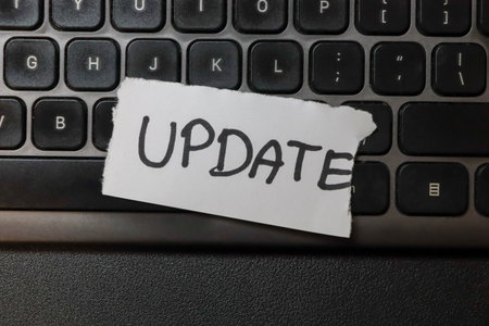 Note with the word UPDATE placed on a computer keyboard highlights the importance of keeping information current. Suitable for technology and communication themes.