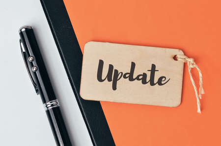Top view of pen, paper holding file and wooden board written with UPDATE