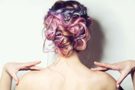 Back view of young woman with modern hairstyle with colorful haircut.