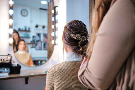 Back view hairstyle of pretty brunette young woman in front of the mirror at beauty salon.
