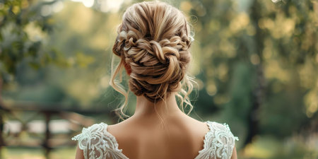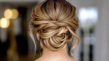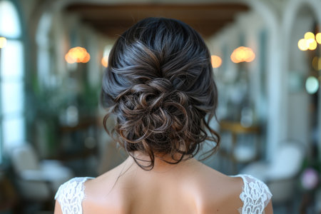 A beautiful updo hairstyle with intricate twists and curls, perfect for a bride on her wedding day, set against a sophisticated venue backdrop