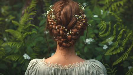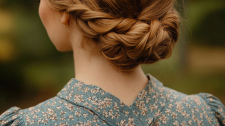 A captivating portrait of a woman showcasing a beautifully braided hairstyle while wearing a vintage floral dress, set against a serene outdoor backdrop.