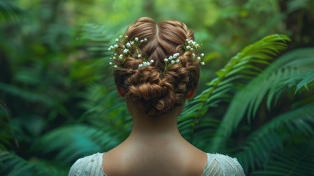 Evening hairstyle with fresh flowers in rustic boho style, the woman from behind
