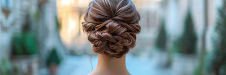 Elegant chignon hairstyle of a woman against the backdrop of the city