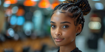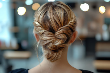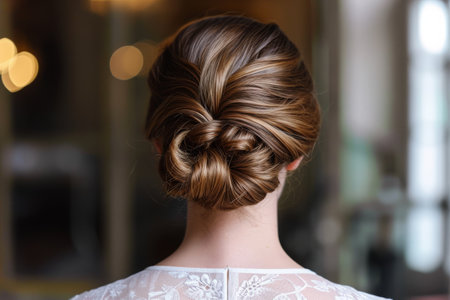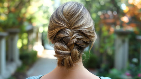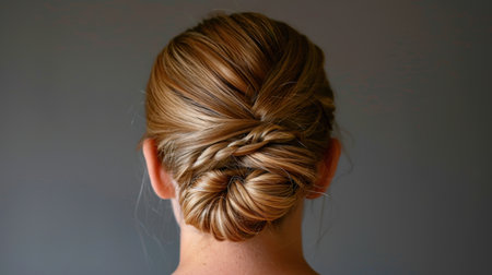 Elegant hairstyle featuring braided bun, showcasing smooth, shiny hair. intricate design highlights beauty of hair texture and style, perfect for formal occasions or everyday wear